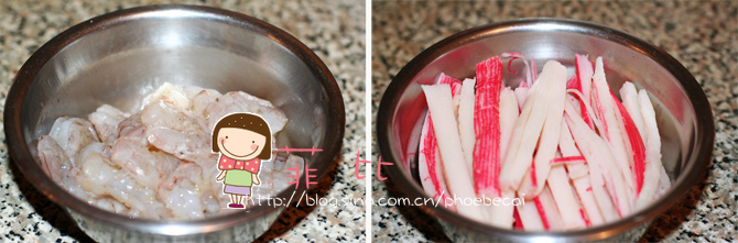胡椒粉和盐腌一下。 四,蟹条切丝