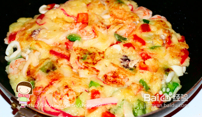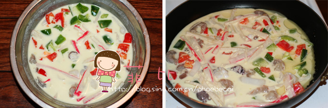 七,把材料加入糊里 八,不沾锅加少许油煎一下。煎到两面金黄就OK啦:)