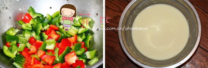 五,青红甜椒(不辣)切粒 六,面粉加水开成糊比例是5009粉加800CC的冷水