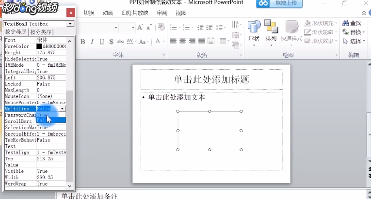 4、选择“文本框”,在幻灯片中拉取一个区域,选中这个区域,单击右键,在弹出列表中选择“属性”。