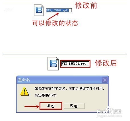 将文件扩展名为mp41(或mvk1或rmvb1)删除掉最后一个1,点击鼠标,扩展名保存为mp4(mvk或rmvb),出现一个提示界面,点"是"按钮。