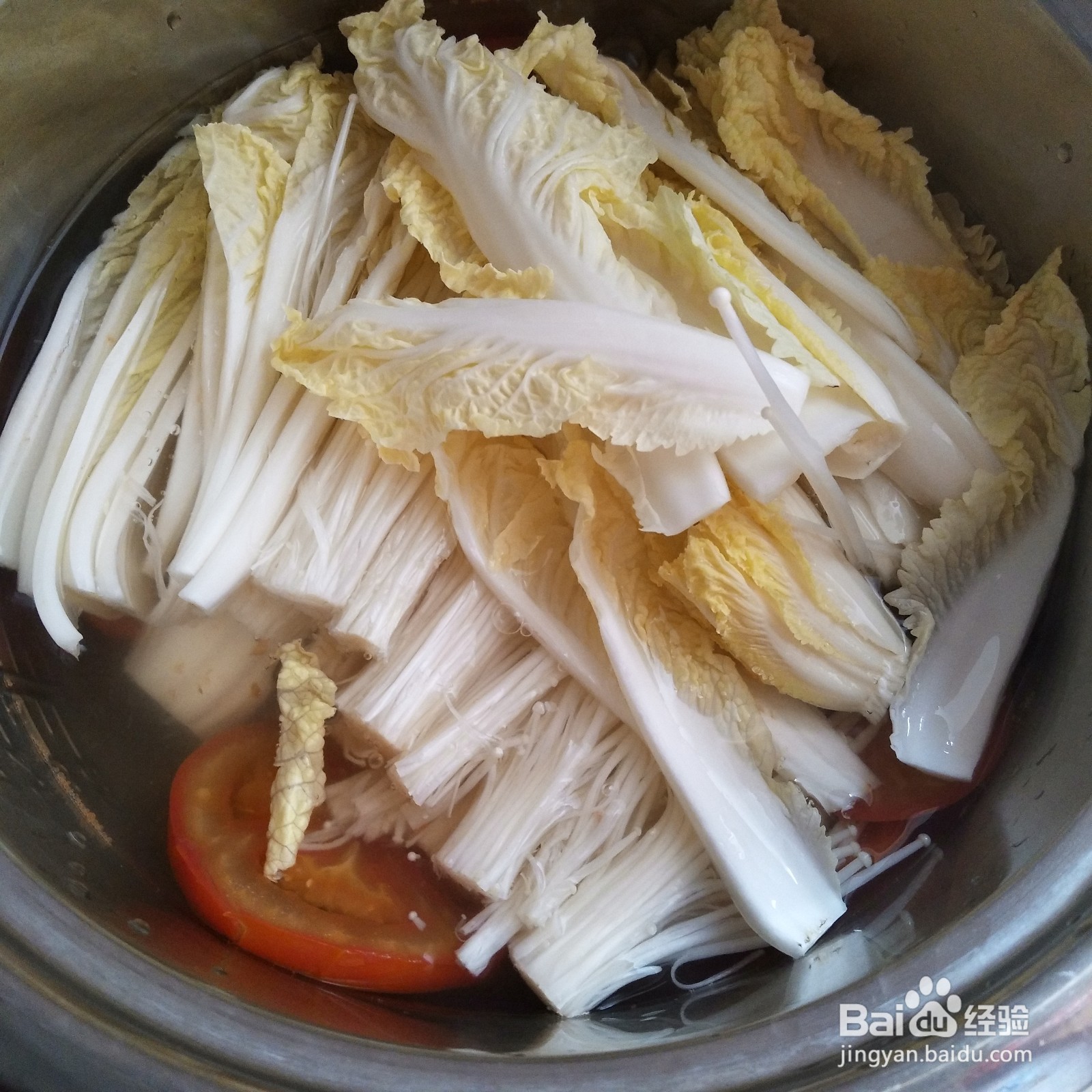 5、接着加入金针菇、娃娃菜和肉卷一起烹煮。