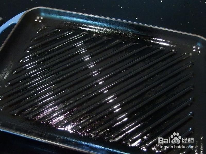 3、准备一个烧烤盘或厚平底锅,热锅后用刷子刷一层油在烧烤盘上。