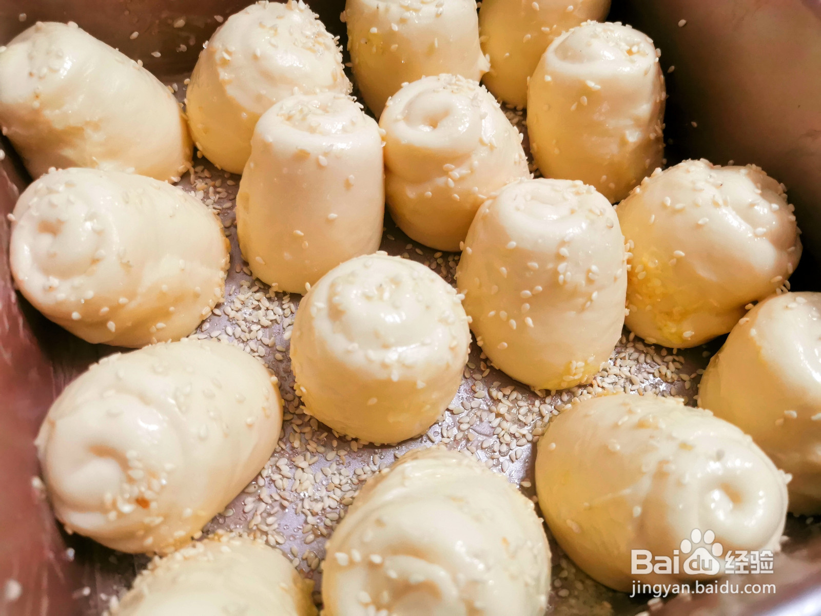 12、做好的面包开始发酵,发酵至两倍大,面包明显蓬松,表面也可以撒上一些芝麻。虽然有些东倒西歪,但是考好之后就会紧紧挨在一起了。