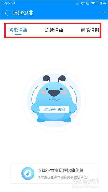 3、在听歌识曲功能中有三种方式,分别为【听歌识曲】、【连续识曲】和【哼唱识别】,这里点击【听歌识曲】。