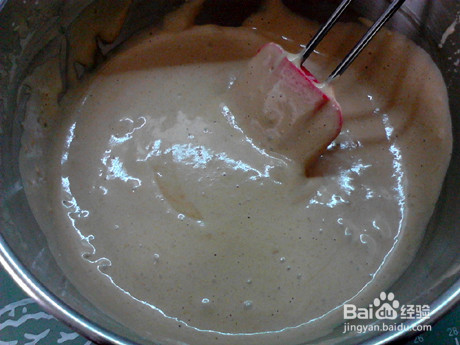 9、用刮刀从底部往上不断翻拌,成均匀细腻的蛋糕糊。