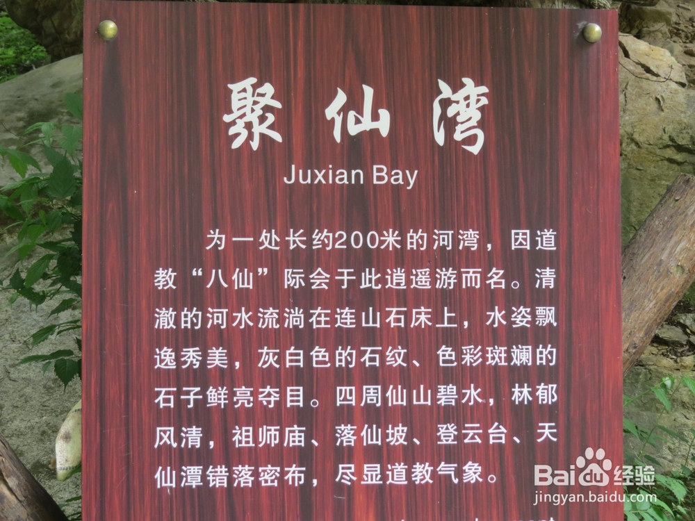 6、在峡谷里转了个弯,走过一座独木桥。这山谷之间忽然就只有我一个人了,耳边只有潺潺的水流声,这一段的水特别清,看到指示牌上标着“戏水区”,忽然就动了下水一戏的念头,找了一块平坦的大石头,脱了鞋袜,便伸入了水中。水真凉啊,有一点刺骨的寒意袭来。就这样泡了一会儿,怎敌凉气逼人,只好穿好鞋袜,继续赶路。没走几步,便看到石崖上有几个红色的大字:“聚仙湾”,相传八仙在此际会。看这山清水秀, 林茂清幽,倒也像神仙聚会处了。