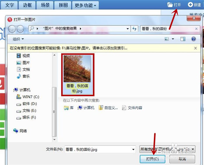 1、首先找到并打开美图秀秀,点击上方的“打开”选项,从电脑中选择图片,再点击下方的“打开”。