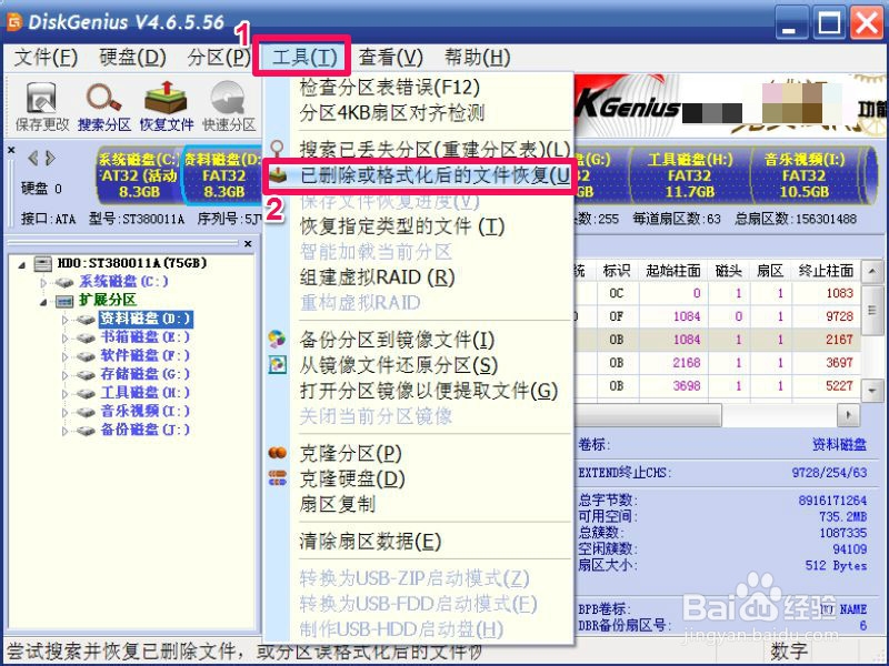 5、5,在菜单项中选择“工具”,然后在其下拉菜单中选择“已删除或格式化后的文件恢复”这一项。