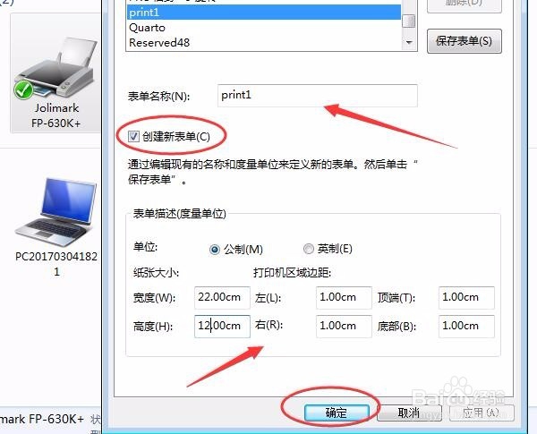 3、勾选“创建新表单”,输入表单名称“print1”,输入已量好的纸张大小宽度22cm,高度12cm,输入四个边距1cm,点击“确定”。