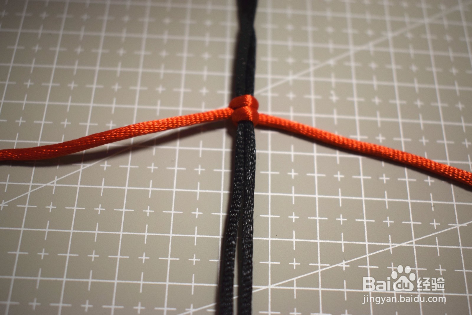 8、将红绳斜过来,将最上方的红色拉下来作轴,继续打斜卷结。