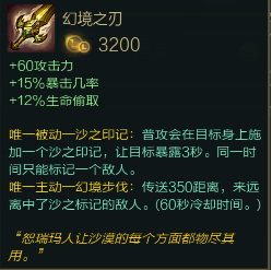 3、第一件大件最好出黑市的幻镜之刃,吸血加暴击,攻击也有60点,最主要的是有位移技能哦