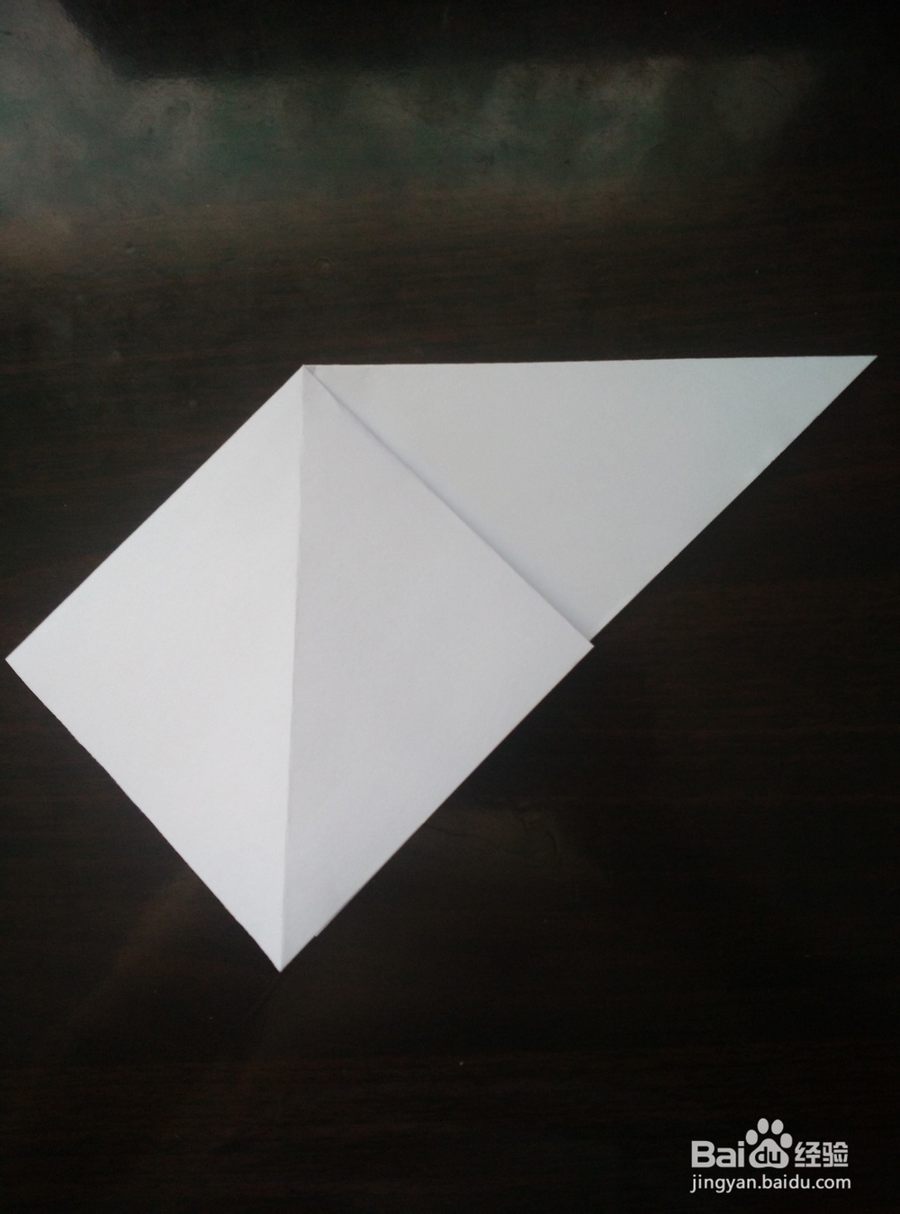 6、翻转180°之后,将另外一个三角形,按照刚压好的正方形对角线的折痕立起来。
