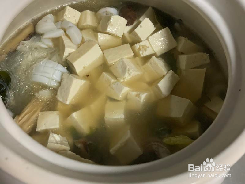 1、准备好所有食材。 墨鱼切成自己喜欢的大小,腐竹泡软掰开,香菇洗净切块,白菜撕块,豆腐切块,裙带菜提前泡发(我买的干干的,商家发错货,不然会是饱满的裙带菜),粉丝提前放碗中温水泡30分钟即可。