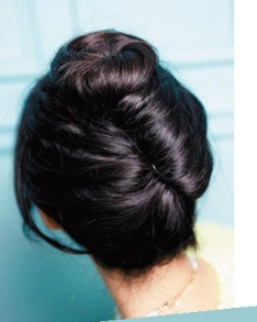 2、用多个黑色小发夹将扭转发辫的发根给固定好,发尾则在头顶盘成花苞头。