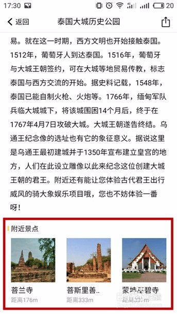 1、打开app,在搜索框输入“泰国”,软件会给出泰国著名景点菜单,根据需求选择想要听讲解的景点,此处选择第一个番沫泰国大城历史公园。