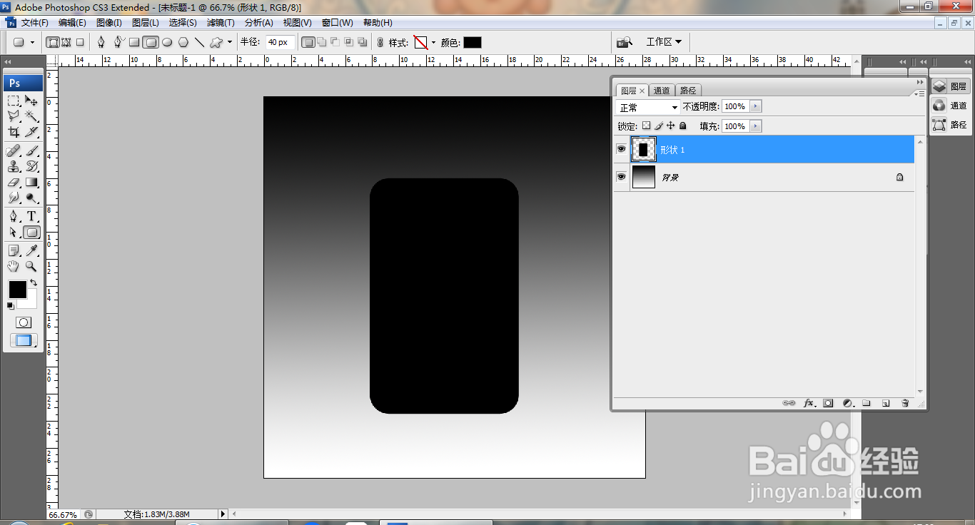 2、选择圆角矩形工具,设置半径为40像素,绘制图形,如图