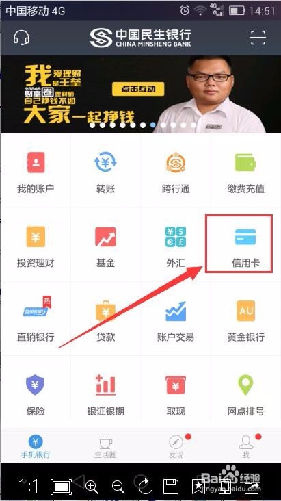 3、3.绑定成功后返回手机银行界面,点击信用卡按钮,进入信用卡中心,可以看到信用卡当前信用额度和信用卡积分等信息。