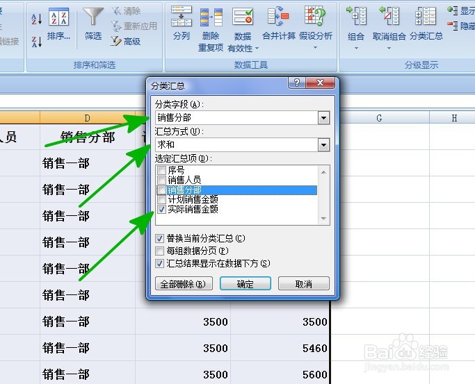 在【选定汇总项】中选择[实际销售金额]选项,然后点击【确定】按钮。