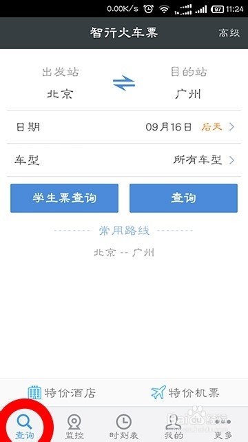 选择好出发站、目的站、乘车日期及车型后点击蓝色按钮“查询”