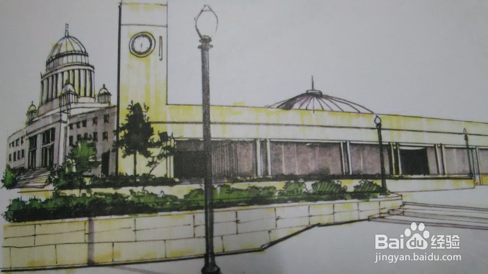 2、完成建筑整体的骨架勾勒后,即可进行部分细节的处理,勾勒周围景物以及建筑物纹理等,并尽可能体现建筑的厚度和立体感。