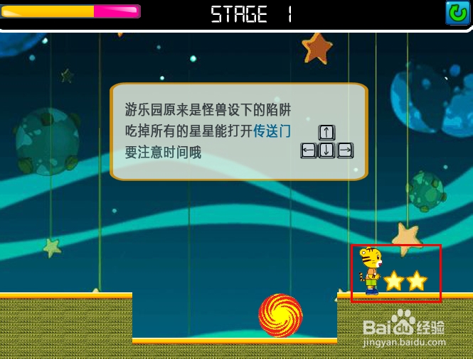 2、进入游戏挑战界面,左上角的黄色能量条是时间条,玩家必须在规定的时间内完成收集所有的星星,然后打开传送门,即可过关。
