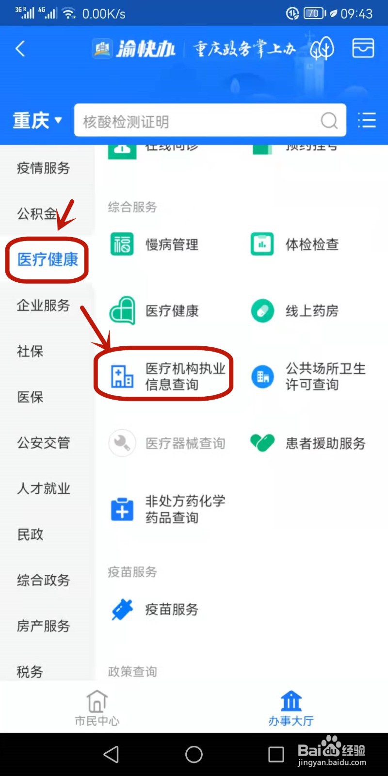3、进入办事大厅界面,点击【医疗健康】→【医疗机构执业信息查询】。
