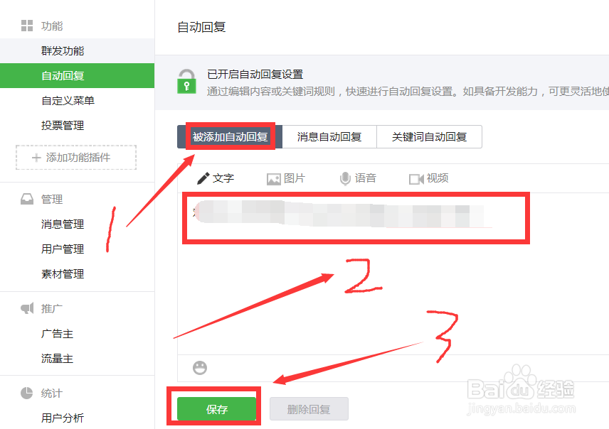 4、在自动回复里有三个选项目,第一个是别人关注了我们的公众号之后,有一个自动给用户的回复,就是在这个地方进行的设置。设置完保存
