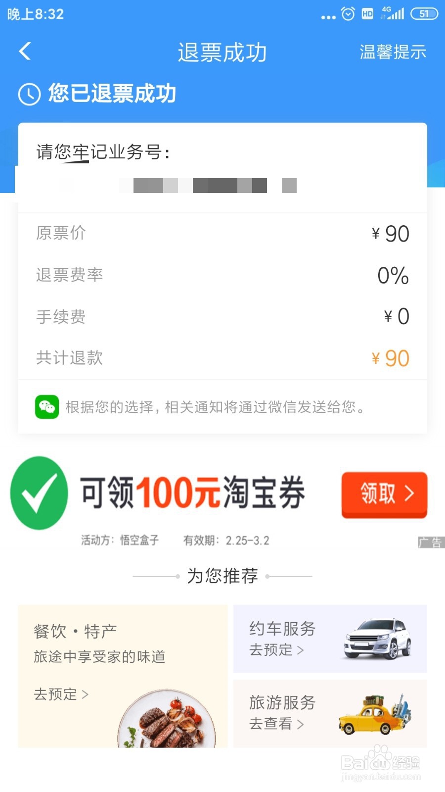 7、退票成功后显示退票金额及“业务号”,建议截图保存。