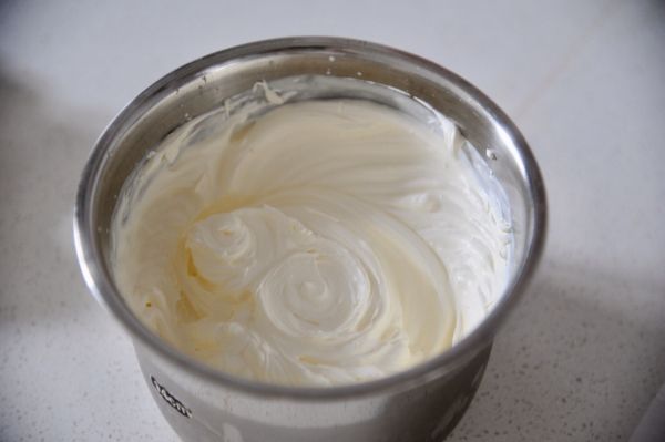 7、蛋清打发至成鱼眼泡时放入三分之一的砂糖.继续打发.打发至蛋白呈小气泡时放入三分之一的砂糖,继续打发.打发至蛋白细腻无气泡时放入剩余的砂糖,继续打发. 打发至蛋白霜提起时,呈小弯钩状态.