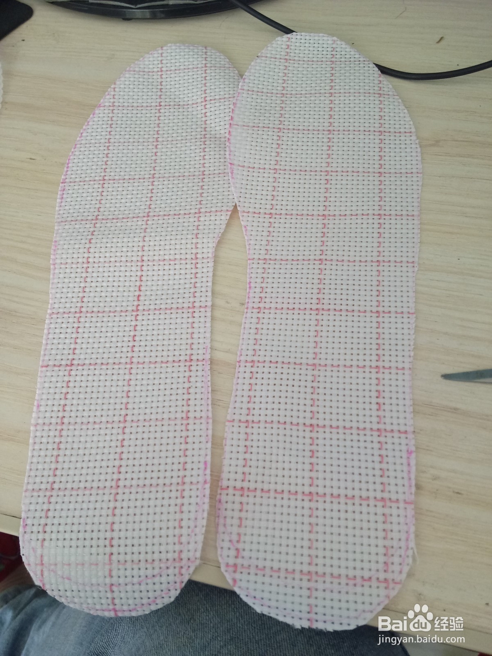1、取适量的十字绣布,剪成需要的大小。接着拿一双鞋垫在十字绣布上画出鞋垫的样子,一共要画出四片。