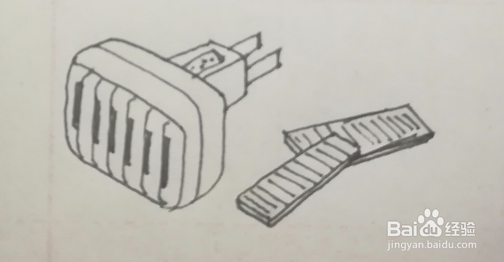 7、第七步,画上两个插头,注意近处的可以稍微大一些。还有,前面的网状结构内,画上一片蚊香,长方形,但是被网状挡住一些,画的时候要注意断开画。