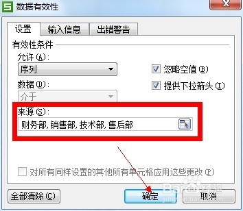 5、在来源框中填入选择项,比如这里填写各部门名称,财务部、销售部、技术部和售后部。注意各个部门之间使用英文逗号,分隔。然后点击确定。