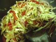 7. 将圆白菜丝、洋葱丝和西红柿下锅。