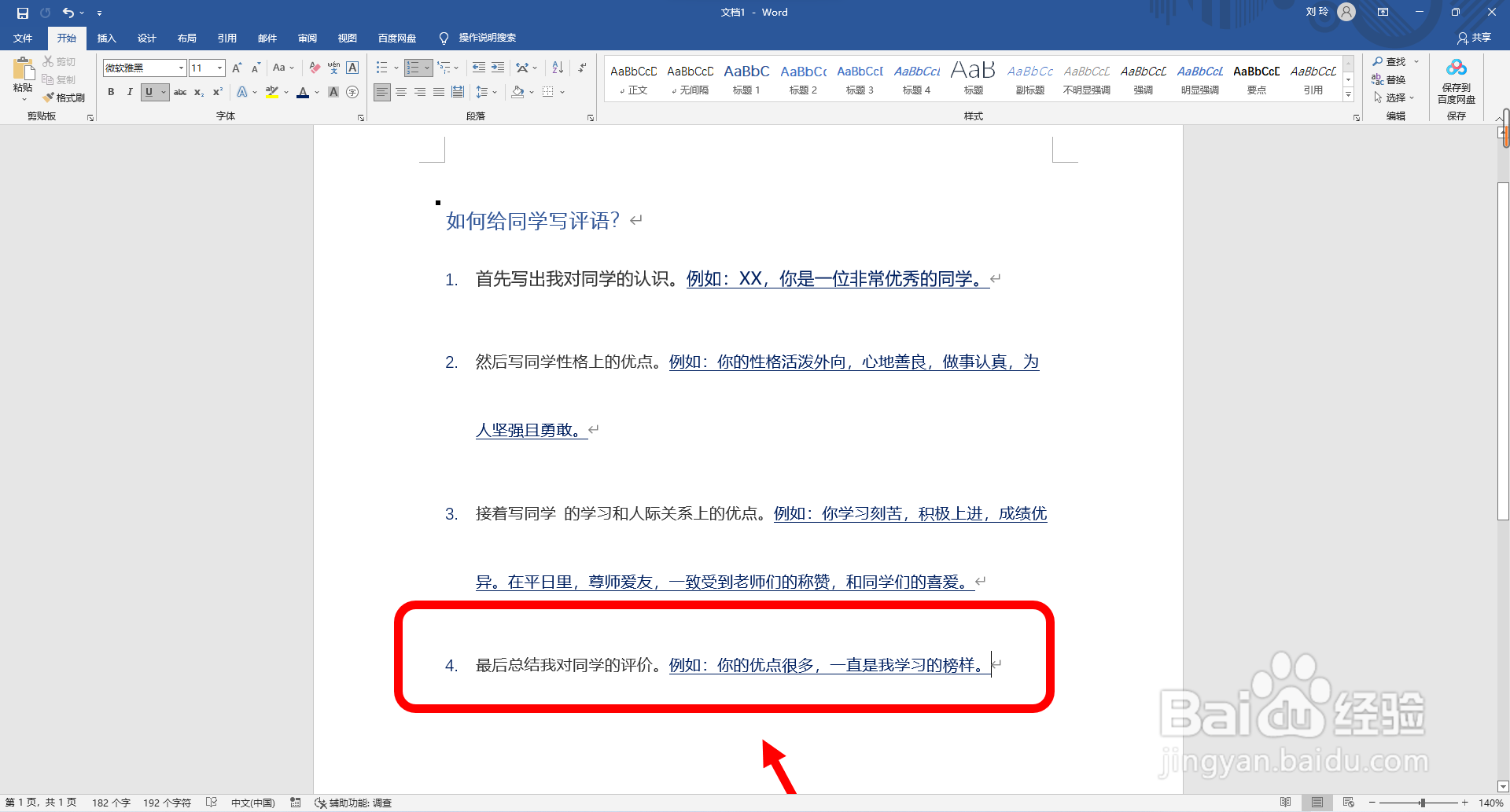 4、最后总结我对同学的评价。你的优点很多,一直是我学习的榜样。