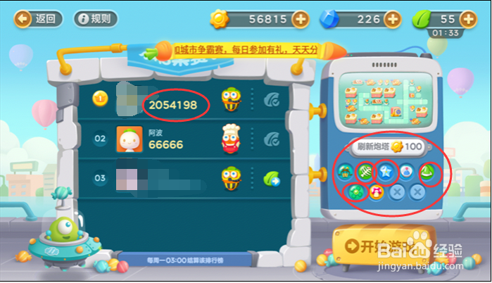 5、现在我们去打糖果赛,个人认为:想获得高分,炮塔里要有减速的炮塔,组合风扇,或者绿导弹炮塔。结果我打出了205万的成绩(如果采用复活,会有更高的分数)
