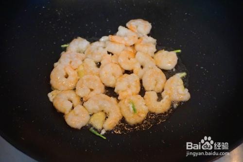 5、锅中放入少许的盐,油温上来之后就可以倒入腌制好的虾仁,开背的大虾会迅速变成虾球。