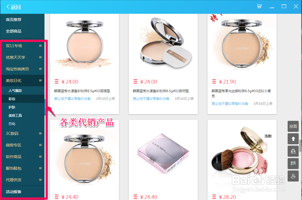 6、我们点击左边列中的“货源”按纽,这里就是最重要的供销物品。这也就是大家最关心的货源好不好,正不正规的问题,都在这里能够发现。