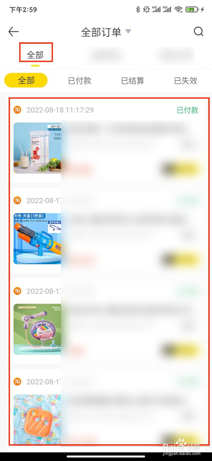 在弹出的全部订单页面中,选择"全部"显示选项,就可以查看到所有的购买商品明细了。