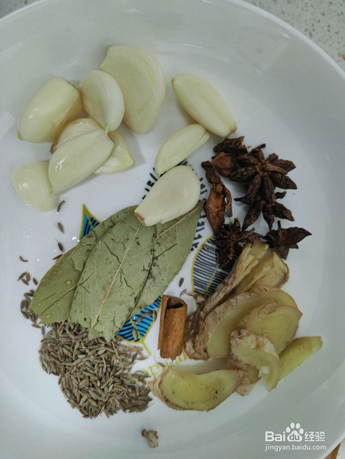 4、准备好,香叶,八角,蒜,孜然,姜片。