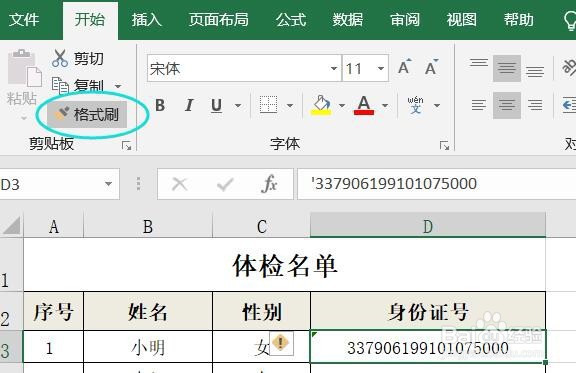 5、最后,为了批量操作方便,可以点击已正确显示的单元格,然后找到【开始】菜单下的【格式刷】命令,从上到下刷一下剩余的单元格,然后依次双击即可