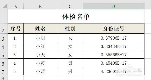 1、打开Excel文档,我们以此表格为示例,可以看到身份证号码显示不正确