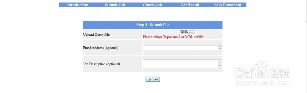 5、上传mol2格式的文件后,填写邮箱,然后"Upload"。调节参数后点击“Submit”。