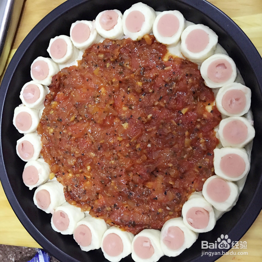 6、披萨饼用叉子叉点孔,边边沾点水,摆上一圈火腿肠段。