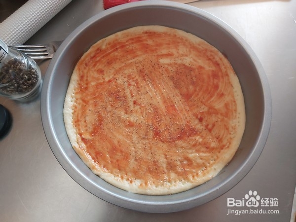 5、把面皮放入披萨盘内,调整均匀,用叉子给饼底扎满小孔。在饼底涂满番茄酱。