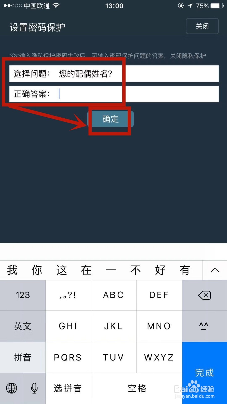 6、在设置密码保护页面,输入答案后,点击确定即可成功设置。