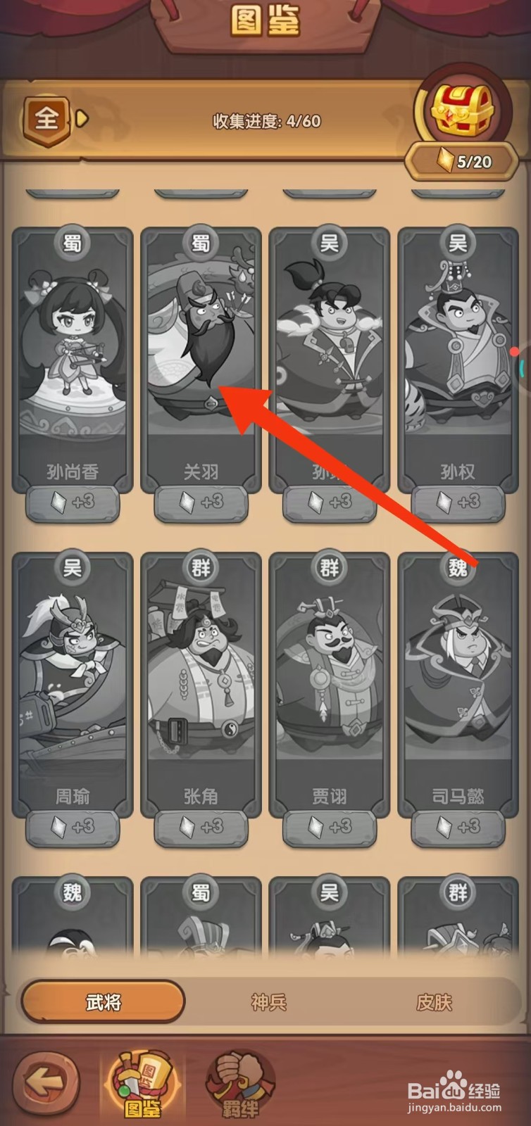 2、第二步:进入图鉴界面,点击【关羽】图标
