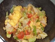 5、炒锅放油加热煸香葱姜,再将西红柿入锅煸炒。