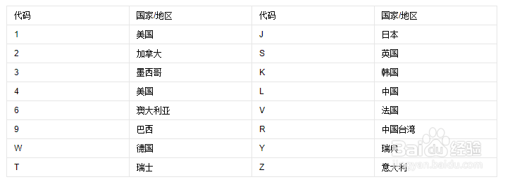 2、第1位代表地理区域,1-美国;J-日本;T-瑞士;2-加拿大;K-韩国;V-法国;3-墨西哥;L-中国;W-德国;6-澳大利亚;R-台湾;9-巴西;Y-瑞典;S-英国;Z-意大利