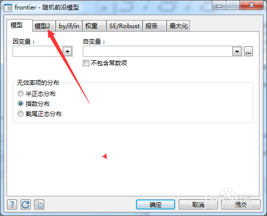 1、首先,点击菜单中的统计菜单,弹出了下拉菜单选中为随机前沿模型选项